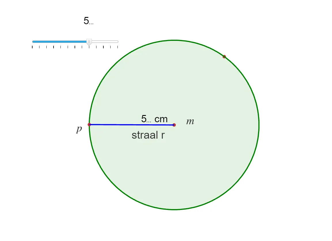 In deze opdracht heb ik met Cabri Express een interactief blad gemaakt van een cirkel en de straal. Het doel is om leerlingen te laten ontdekken wat de straal precies voorstelt en hoe die samenhangt met de omtrek en de oppervlakte van de cirkel. De cirkel heeft een vast middelpunt "m" en een punt "p" op de rand. De lijn tussen "m"en "p" is de straal, waarvan de lengte automatisch zichtbaar wordt. Door het punt op de rand te verslepen verandert de lengte van de straal, waardoor leerlingen direct kunnen zien hoe de afstand tussen het middelpunt en de cirkelrand de grootte van de hele figuur bepaalt. De schuifknop linksboven wordt gebruikt als symbolische aanduiding van de waarde van de straal. Zo kunnen leerlingen verschillende situaties verkennen, bijvoorbeeld wat er gebeurt bij r = 3, r = 5 en r = 7.