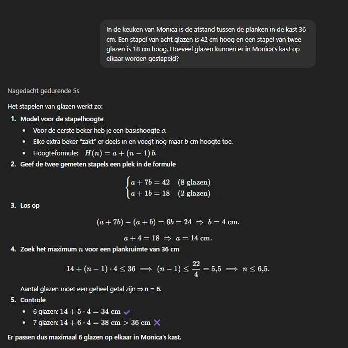 Daarna stelde ik een redeneringsvraag over de glazen in Monica’s kast: Een stapel van acht glazen is 42 cm hoog en een stapel van twee glazen is 18 cm hoog. Hoeveel glazen kunnen er in de kast van 36 cm worden gestapeld? ChatGPT herkende direct dat de hoogte van het eerste glas anders meetelt dan de tussenruimtes, berekende het verschil per extra glas (4 cm) en kwam correct uit op zes glazen.