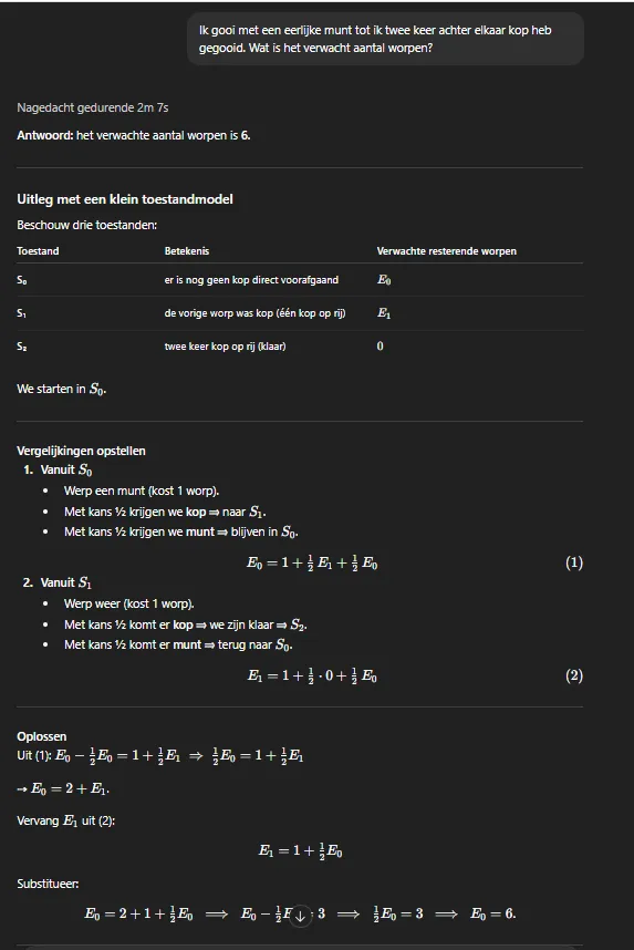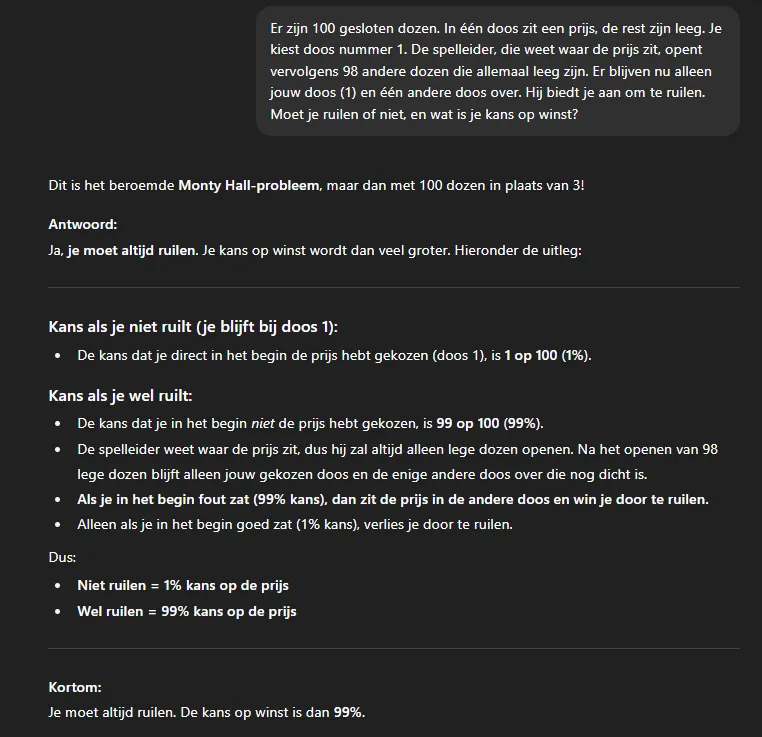 Ook bij kansrekening bleek het model sterk. Op de vraag “Ik gooi met een eerlijke munt tot ik twee keer achter elkaar kop heb gegooid. Wat is het verwachte aantal worpen?” gaf het antwoord 6, exact het juiste verwachte resultaat met een juiste uitleg over toestanden en kansen. En bij een bekend probleem, het Monty Hall-probleem met 100 dozen herkende ChatGPT het principe meteen: het adviseerde te ruilen, met een kans op winst van 99 % tegenover 1 % als je bij je eerste keuze blijft.