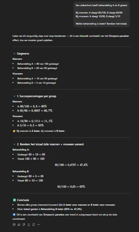 De eerste vraag ging over een ziekenhuis dat twee behandelingen testte. Bij mannen had behandeling A 80 successen op 100, en B 60 op 90. Bij vrouwen had A 10 op 90 en B 5 op 10. De vraag was: Welke behandeling is beter, bereken het totaal. ChatGPT berekende het totaal correct en kwam tot de conclusie dat behandeling A overall iets beter scoort. Het model legde ook netjes uit waarom de optelling over de hele populatie anders kan uitvallen dan binnen afzonderlijke groepen.