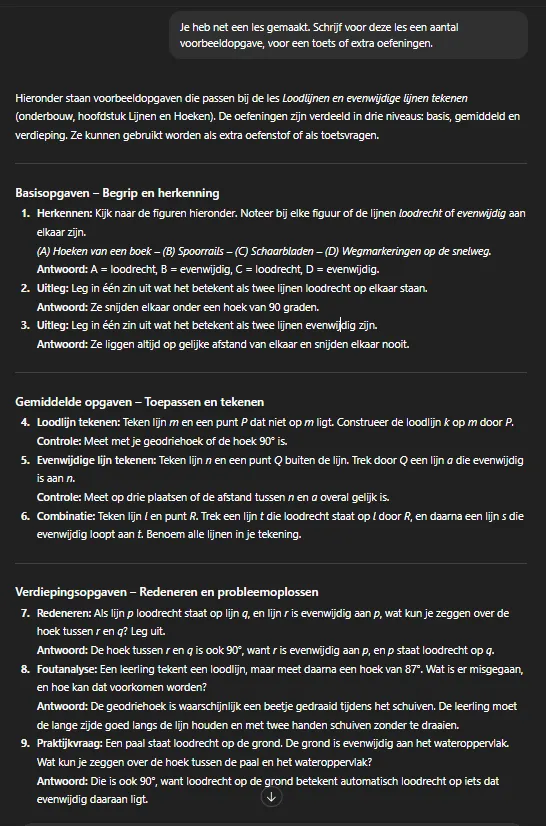 De oefeningen die ChatGPT heeft gemaakt passen goed bij de les. Ze lopen logisch op van makkelijk naar moeilijk en sluiten precies aan bij wat ik wil dat leerlingen leren: herkennen, tekenen en redeneren over loodrechte en evenwijdige lijnen. De opdrachten zijn duidelijk en haalbaar voor de onderbouw. Ik vind ze goed bruikbaar, vooral omdat er ook vragen tussen zitten waarbij leerlingen moeten uitleggen waarom iets zo is of waar een fout zit. Dat maakt het niet alleen oefenen, maar ook nadenken. De antwoorden die ChatGPT erbij geeft kloppen allemaal en zijn helder uitgelegd. Kortom: de opgaven zijn goed te gebruiken in de klas of als extra oefening. Ik zou alleen wat zinnen iets korter of simpeler maken voor mijn leerlingen, maar verder zijn ze gewoon prima.