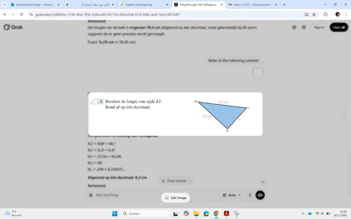 De AI past Pythagoras verkeerd toe omdat ze de hypotenusa en een rechthoekszijde verwisselt. In de tekening is ML = 6,4 cm de schuine zijde (hypotenusa), want die ligt tegenover de rechte hoek bij K. De gezochte zijde KL is dus een rechthoekszijde. Dan mag je niet optellen, maar moet je juist aftrekken:
