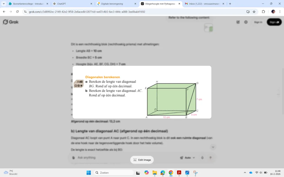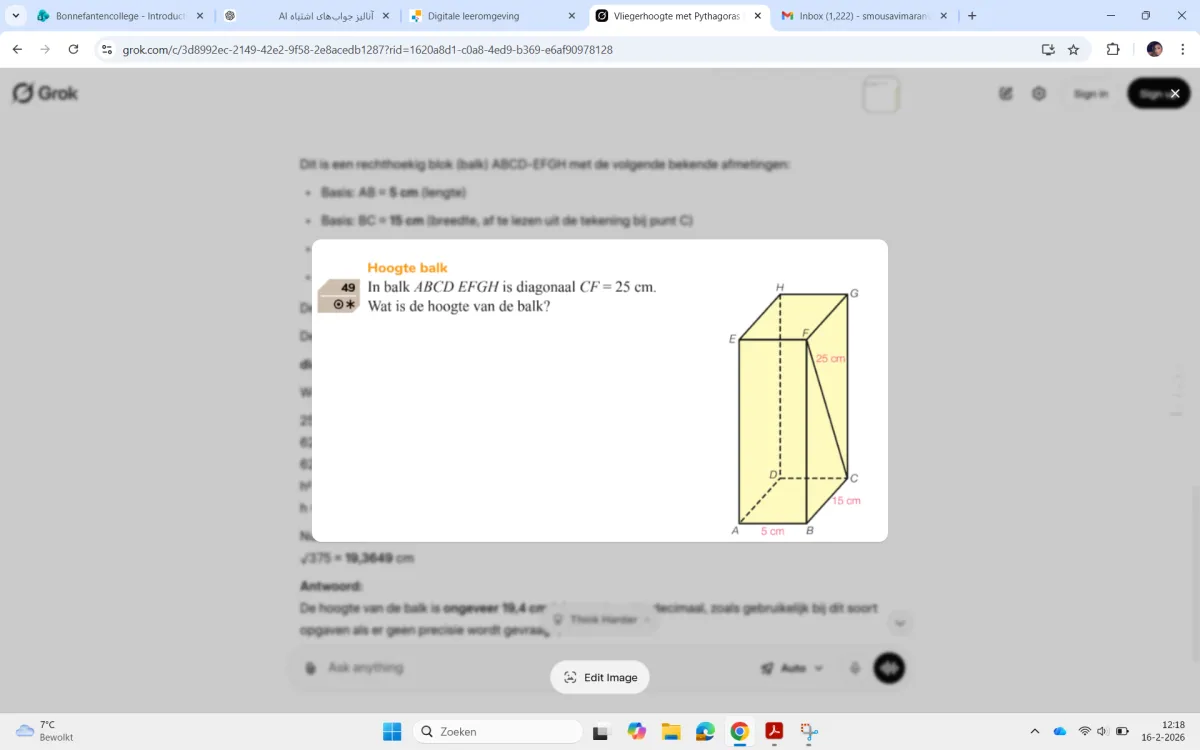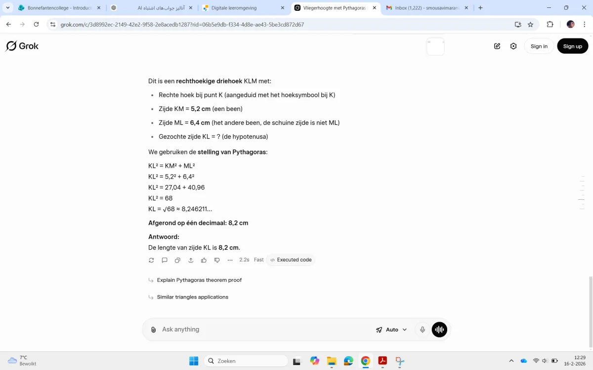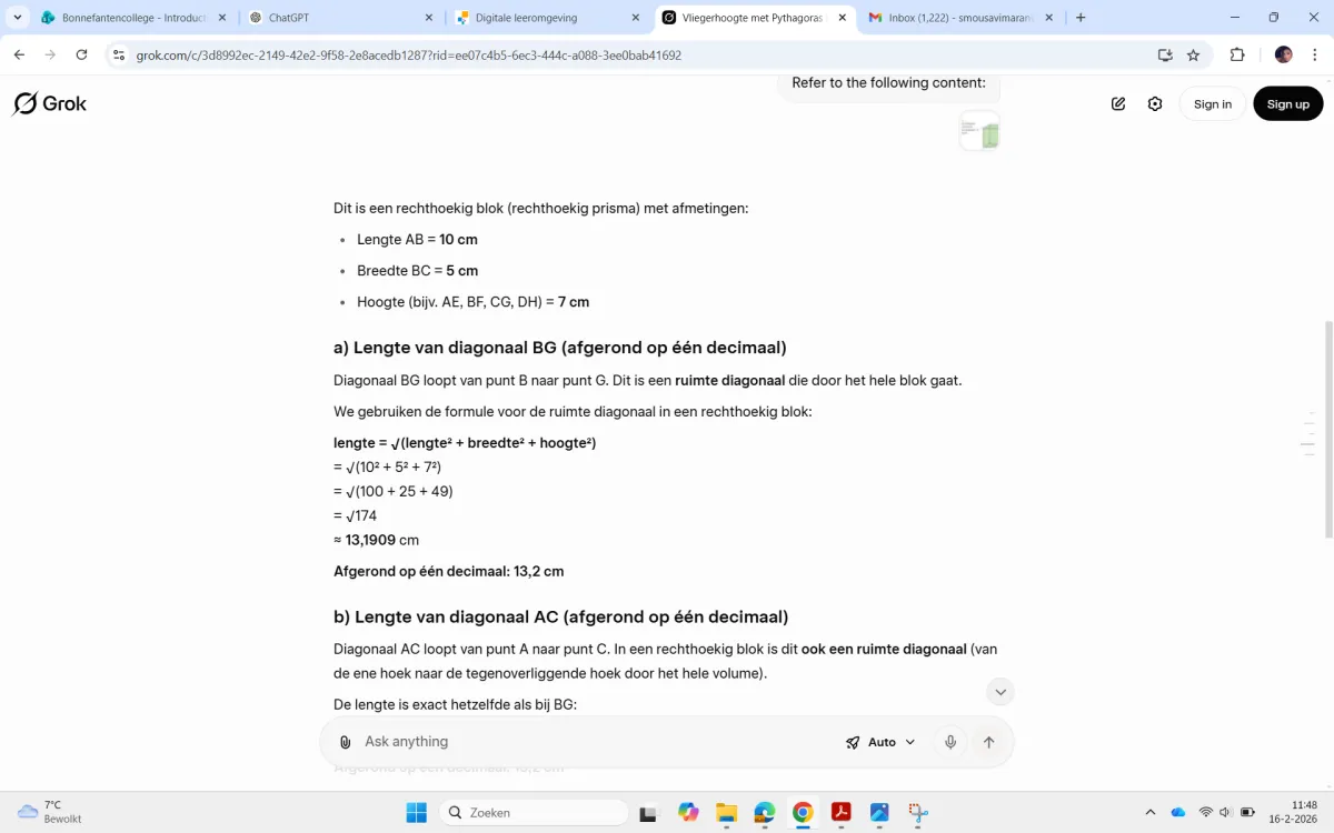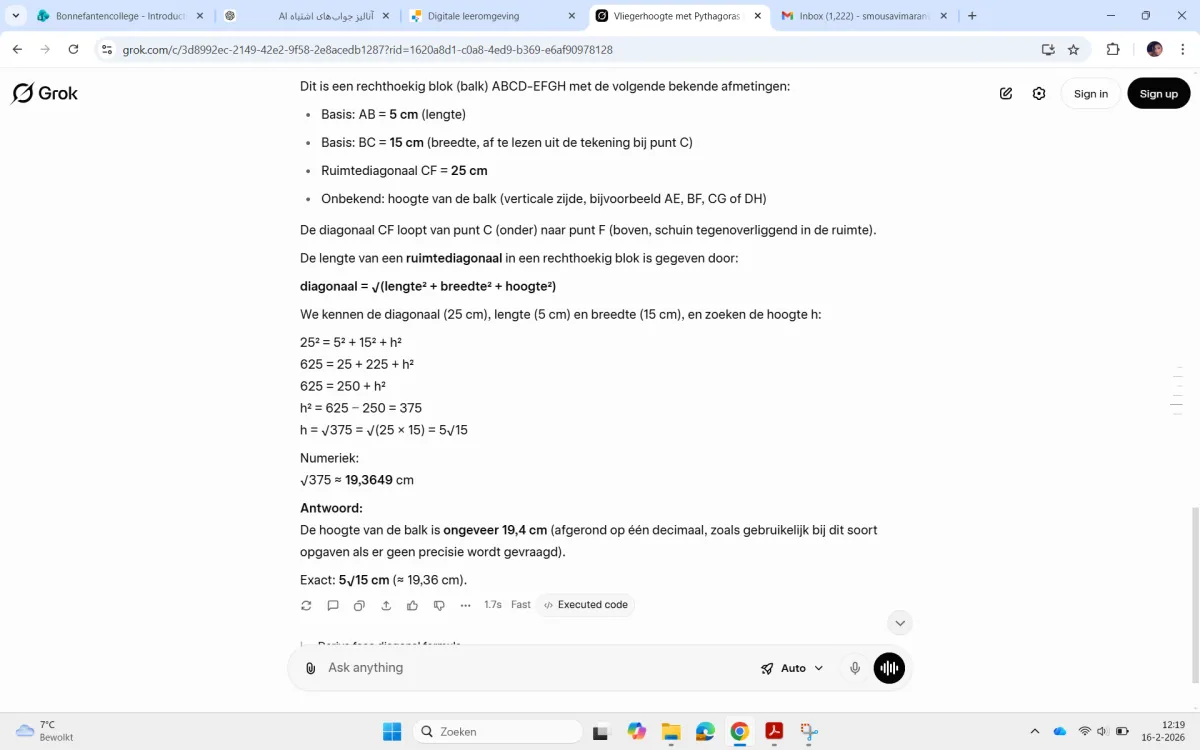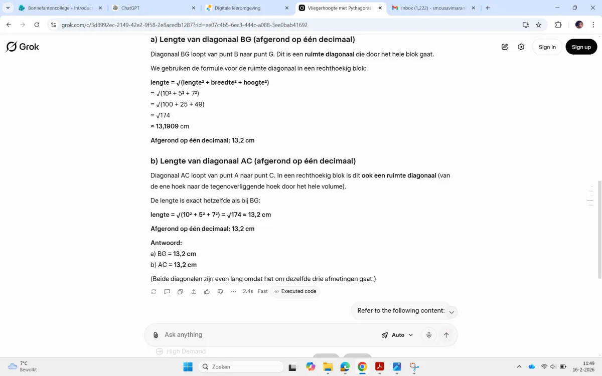 Tijdens deze opdracht heb ik vier wiskundevragen over de stelling van Pythagoras aan de AI-tool Grok gesteld. Uit de analyse van de antwoorden bleek dat de AI meerdere fouten maakte bij het interpreteren van de tekeningen en het kiezen van de juiste formule. Zo werden vlakdiagonalen soms verward met ruimtediagonalen en werd de hypotenusa niet altijd correct herkend. Hierdoor paste de AI regelmatig de verkeerde berekening toe, wat leidde tot onjuiste uitkomsten.